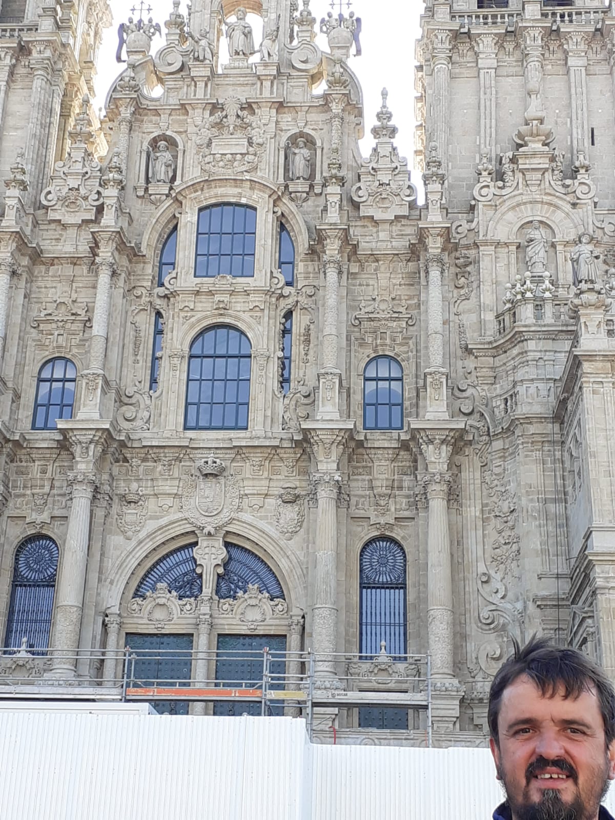 Mergem destul de repede, ajunși în Monte do Gozo se zăresc în depărtare turlele catedralei din Santiago. Sentimente ciudate ne cuprind, atât pe mine cât și pe Vasi, nu știm ce să facem să râdem sau să plângem de emoții, așa că râdem cu lacrimi. Ceva s-a schimbat, parcă ne cade o greutate de pe umeri știind că aproape am ajuns. Drumul spre oraș e plin de peripeții datorită lucrărilor de infrastructură, trotuarele devastate erau pentru mine adevărate piste de slalom.